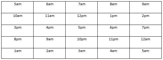3. Do you worry you don’t have the time? Fill in your typical daily activities on the timeline below. Where could you reclaim an extra 30 minutes? Does that rerun on television or updating your Facebook page three times each day really deserve your attention?